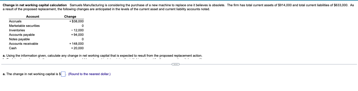 Change in net working capital calculation Samuels Manufacturing is considering the purchase of a new machine to replace one it believes is obsoleteThe firm has total current assets of.